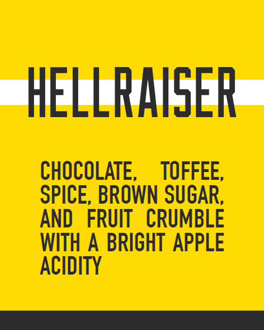 Hellraiser is our original blend that's been with us since day one. It's a crowd pleaser, roasted for all brew methods. Notes of Chocolate, Toffee, Spice, Brown Sugar, and Fruit Crumble with a bright Apple acidity.